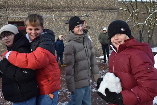 Schnee bedeckt den Schulhof, alles wirkt friedlich und ruhig – zumindest während des Unterrichts. In den Pausen hingegen herrscht reger Trubel: Schülerinnen und Schüler trotzen der Kälte, bauen Schneemänner, liefern sich spontane Schneeballschlachten oder genießen einfach die besondere Atmosphäre eines verschneiten Schulgeländes.