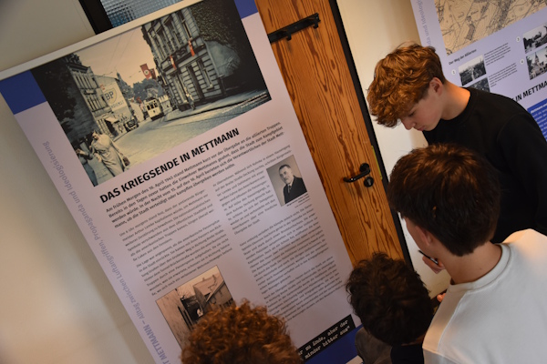 Dieses historische Ereignis nehmen wir zum Anlass, uns im schulischen Kontext intensiv mit der lokalen Geschichte auseinanderzusetzen. Im Rahmen unserer Bildungspartnerschaft mit dem Stadtarchiv Mettmann wurde heute in Raum A117 eine Ausstellung zum Thema "Mettmann im Zweiten Weltkrieg" aufgebaut. Bereits jetzt stößt die Ausstellung auf großes Interesse und wird von zahlreichen Kursen und Besuchergruppen intensiv genutzt.