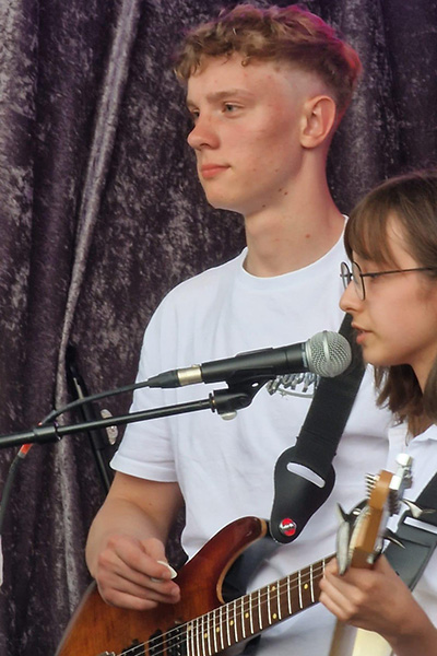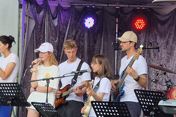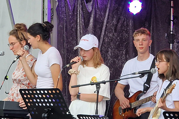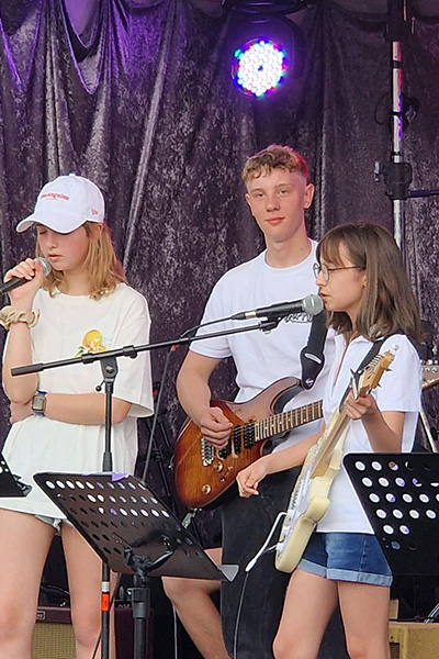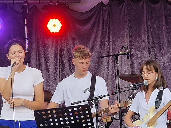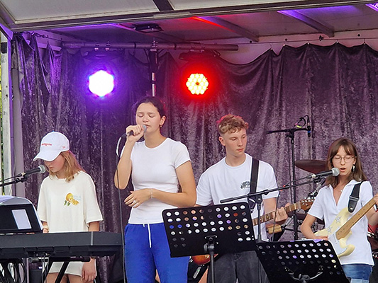 Die neun talentierten "Heine Heroes" aus den Stufen 6 bis 10 ließen sich von der wilden Wetterlage nicht davon abbringen, ihr abwechslungsreiches Set aus sieben Pop- und Rocksongs zu performen. Dabei zeigten die Jungen und Mädchen viel Coolness und musikalische Souveränität. Die Heine Heroes eröffneten das Line-Up aus lokalen Bands, die der Bürgerverein eingeladen hatte, um beim Sommerfest für rockige Stimmung zu sorgen. Schon letztes Jahr hatte die Schulband beim Sommerfest gespielt und viel positive Resonanz erhalten. Auch diesmal wurden die Schülerinnen und Schüler in höchsten Tönen gelobt, wobei vor allem die Auswahl an weniger typischen und dafür komplexeren Songs wie "Locked out of Heaven" von Bruno Mars, "Ruby" von den Kaiser Cheifs oder "Complicated" von Avril Lavigne Beachtung fand. Besonders begeisterten die Heine Heroes mit ihrem eigenen Song "Kerosene", den sie zum Abschluss mitreißend performten. Eine baldige Aufnahme und Veröffentlichung ist bereits in Planung.