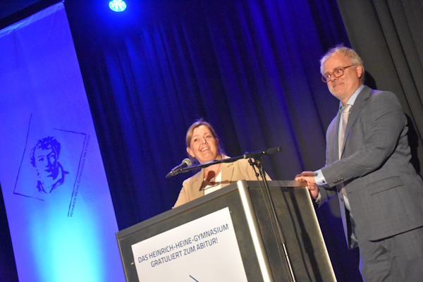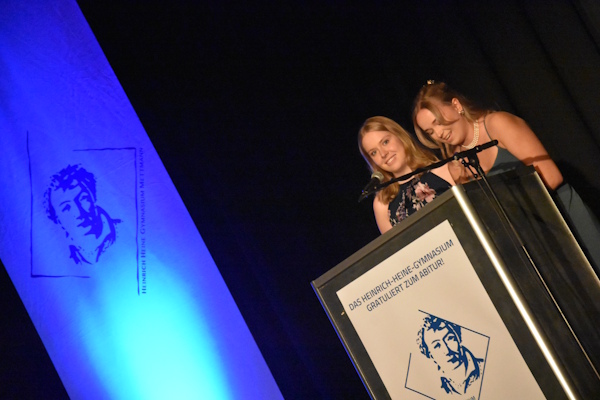 Nach dem feierlichen Einzug der Abiturienen begrüßten die Stufenleiter Frau Sinha und Herr Kamphausen das Publikum mit wertschätzenden Worten für eine ganz besondere Jahrgangsstufe. Emotionaler Höhepunkt des Nachmittags war die herausragende Schülerrede von Antonia Sörgel und Hannah Schmidt, die das Schulleben ihrer Stufe mit einem Augenzwinkern mit dem Film Hangover verglichen, dem Namensgeber für das diesjährige Abi-Motto „HeineOver“.