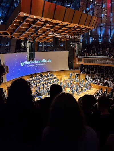 Bereits beim Reingehen in die Tonhalle war klar, dass dies kein normales Konzert wird. Der Saal war riesig und richtig beeindruckend, und durch die besondere Architektur hatte alles eine festliche, aber trotzdem irgendwie gemütliche Stimmung. Wir saßen im oberen Rang, also ziemlich weit oben, aber man konnte das ganze Orchester und sogar den Live Zeichner Peter Theiss super sehen.