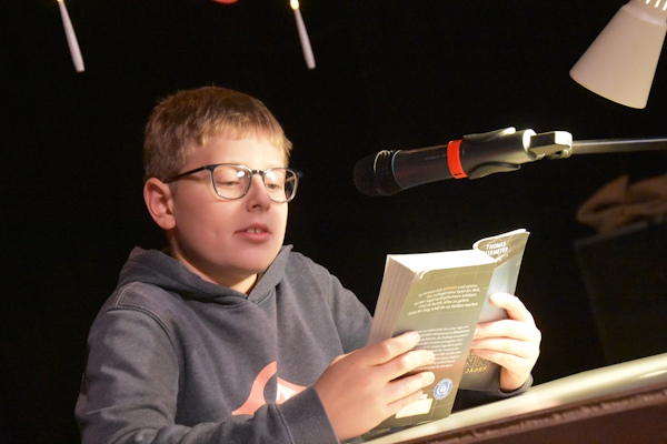 Mats (6A) las aus „World Runner – Die Jäger“ von Thomas Thiemeyer und brachte die futurische Spannung des Romans auf die Bühne.