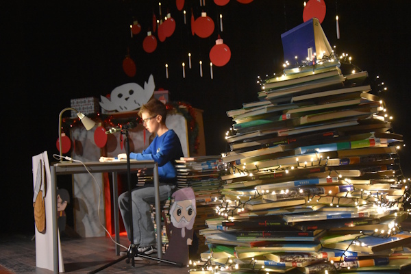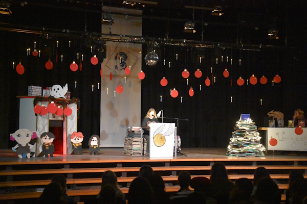 Ein knisternder künstlicher Kamin, ein prächtiger Weihnachtsbaum – kunstvoll aufgebaut aus lauter Büchern – und ein majestätischer Vorlesethron bildeten die zauberhafte Kulisse für den diesjährigen Vorlesewettbewerb der 6. Klassen.