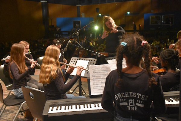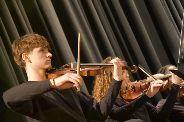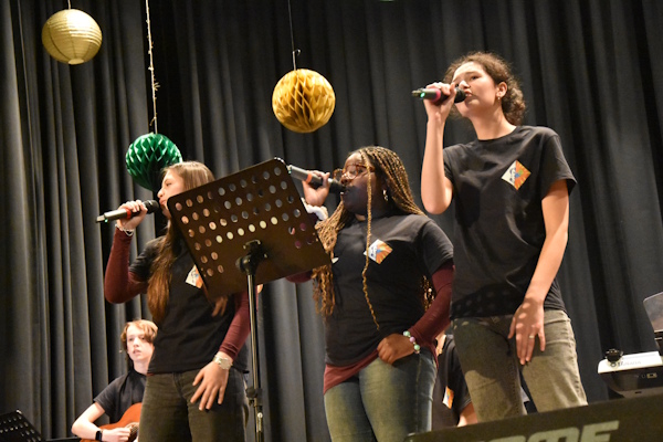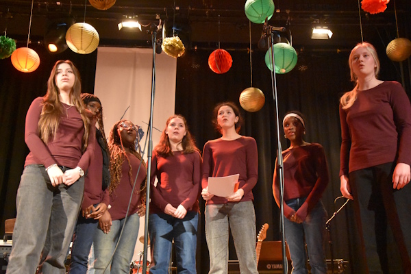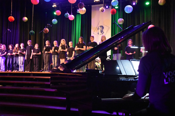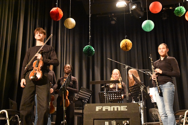 Zwischen den Theaterszenen bereicherten die musikalischen Formationen des HHG die Veranstaltung mit festlichen Klängen und stimmungsvollen Beiträgen. Die Chöre Vocal Lights und Vocal Glow, die Rockband Heine Heroes mit unter anderem „Last Christmas“, das Schulorchester sowie der Oberstufenchor Vocal Flow mit einer wunderbaren Version von „Have Yourself a Merry Little Christmas“ sorgten für musikalische Höhepunkte und eine beeindruckende Bandbreite. Die intensive Vorbereitung der Musikfachschaft war in jedem Beitrag spürbar und trug wesentlich zum Gelingen des Abends bei.