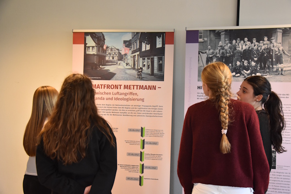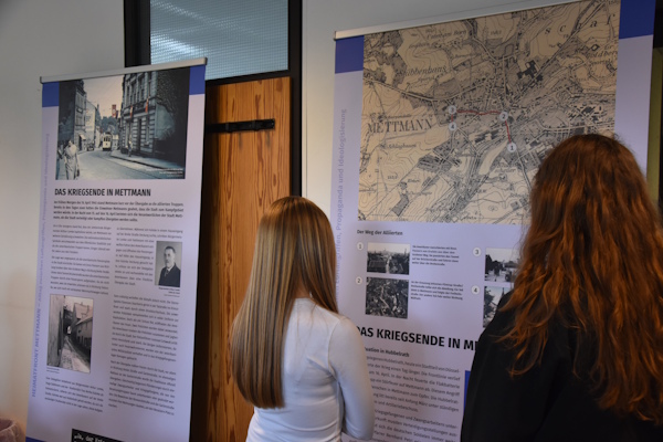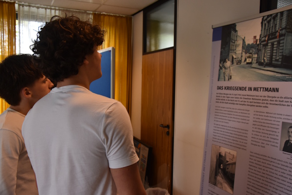 Dieses historische Ereignis nehmen wir zum Anlass, uns im schulischen Kontext intensiv mit der lokalen Geschichte auseinanderzusetzen. Im Rahmen unserer Bildungspartnerschaft mit dem Stadtarchiv Mettmann wurde heute in Raum A117 eine Ausstellung zum Thema "Mettmann im Zweiten Weltkrieg" aufgebaut. Bereits jetzt stößt die Ausstellung auf großes Interesse und wird von zahlreichen Kursen und Besuchergruppen intensiv genutzt.